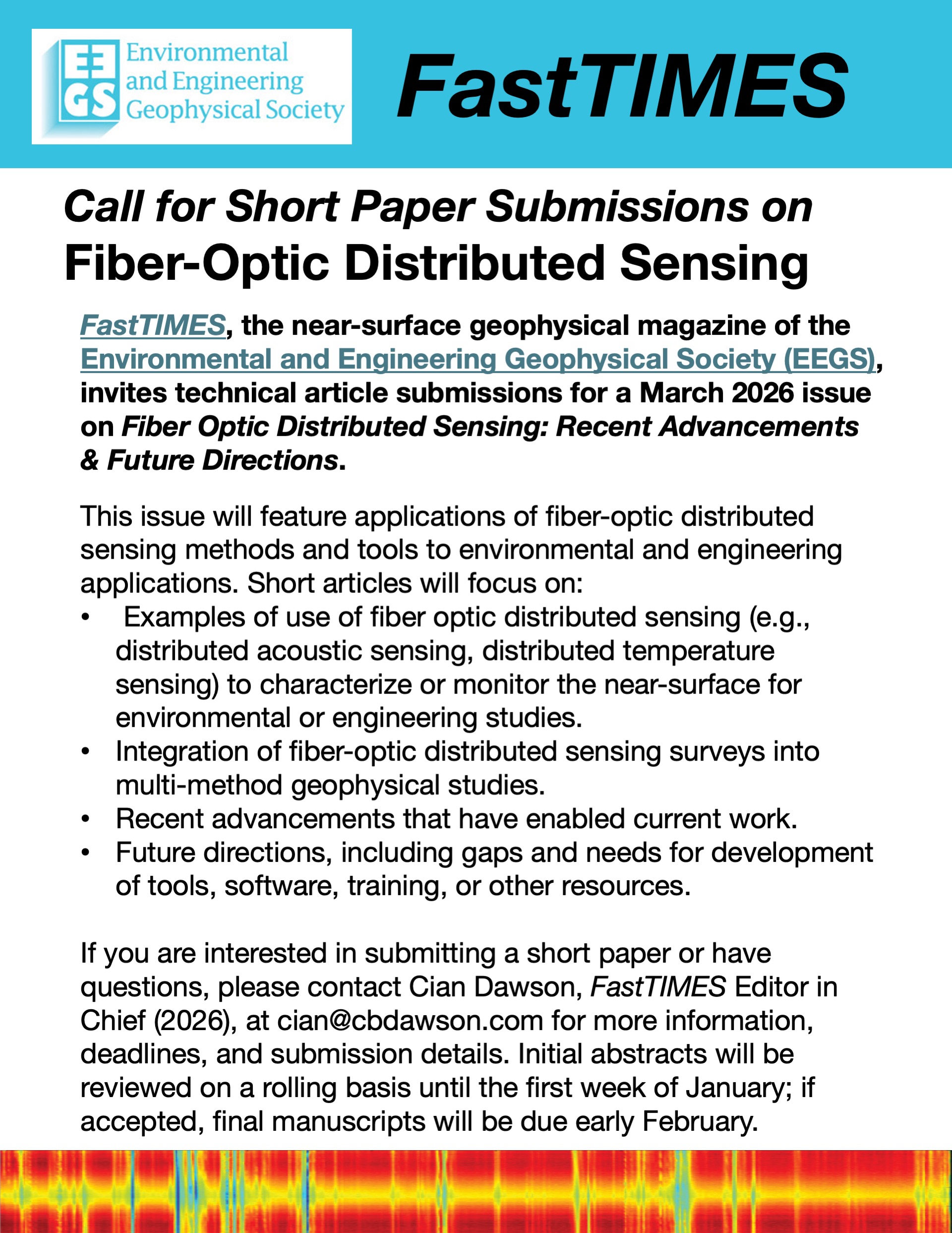 FastTIMES invites technical article submissions for a March 2026 issue focused on Fiber Optic Distributed Sensing: Recent Advancements & Future Directions. This issue of the magazine will feature applications of fiber-optic distributed sensing methods and tools to environmental and engineering applications.